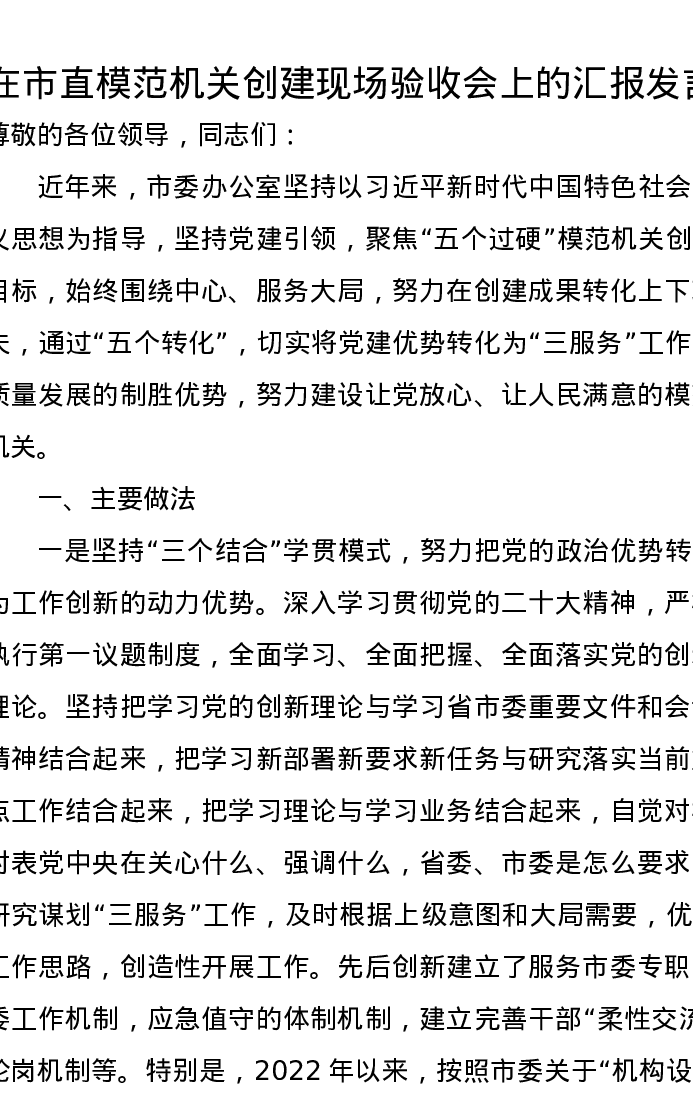 在市直模范机关创建现场验收会上的汇报发言