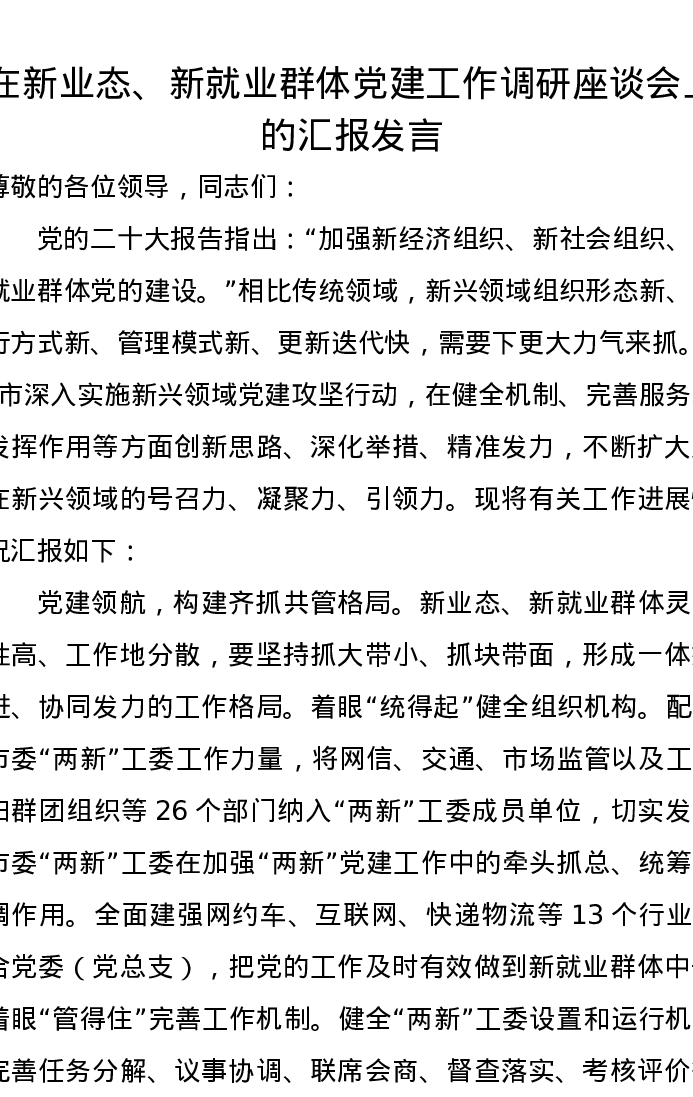 在新业态、新就业群体党建工作调研座谈会上的汇报发言