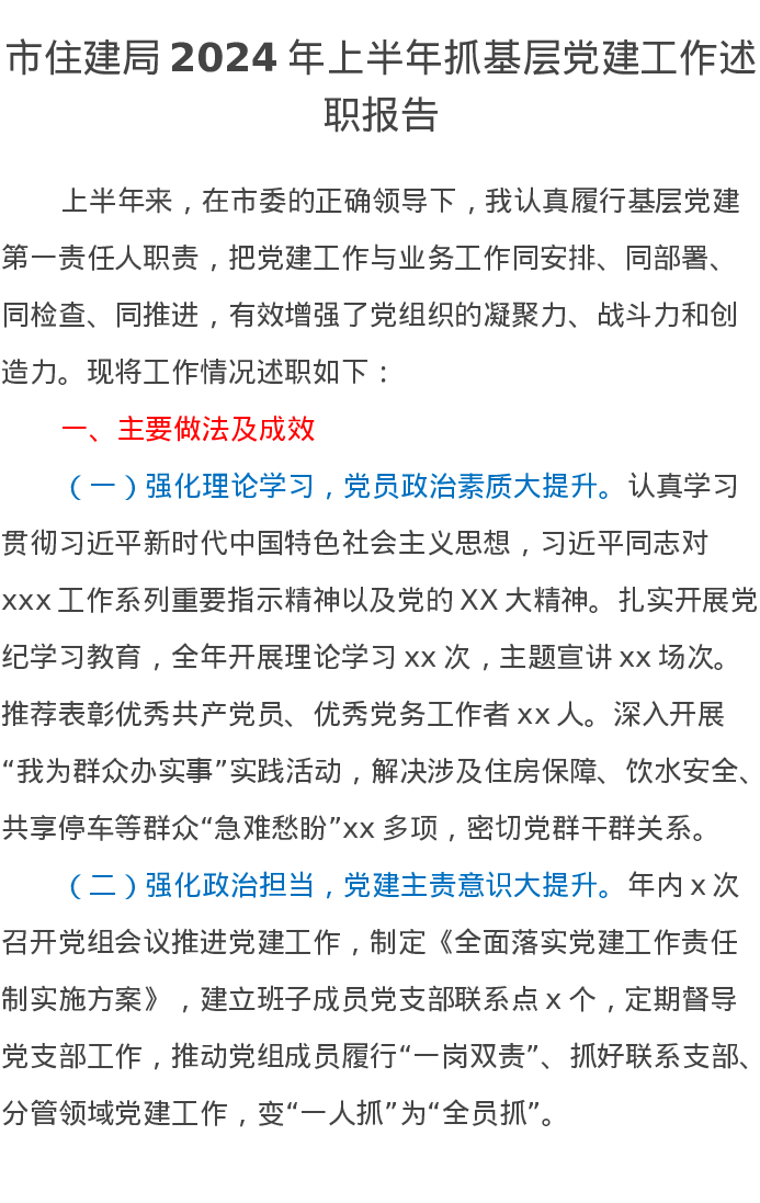 市住建局2024年上半年抓基层党建工作述职报告