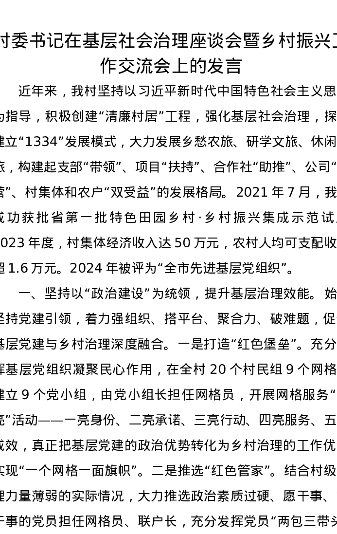 村委书记在基层社会治理座谈会暨乡村振兴工作交流会上的发言