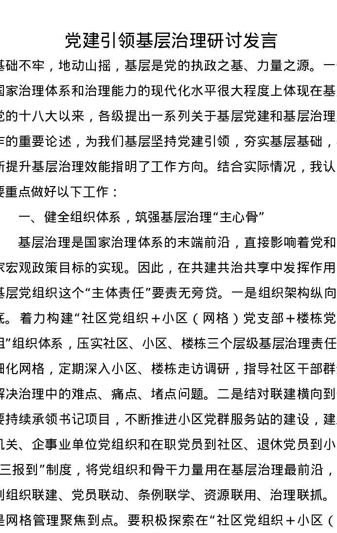 党建引领基层治理研讨发言