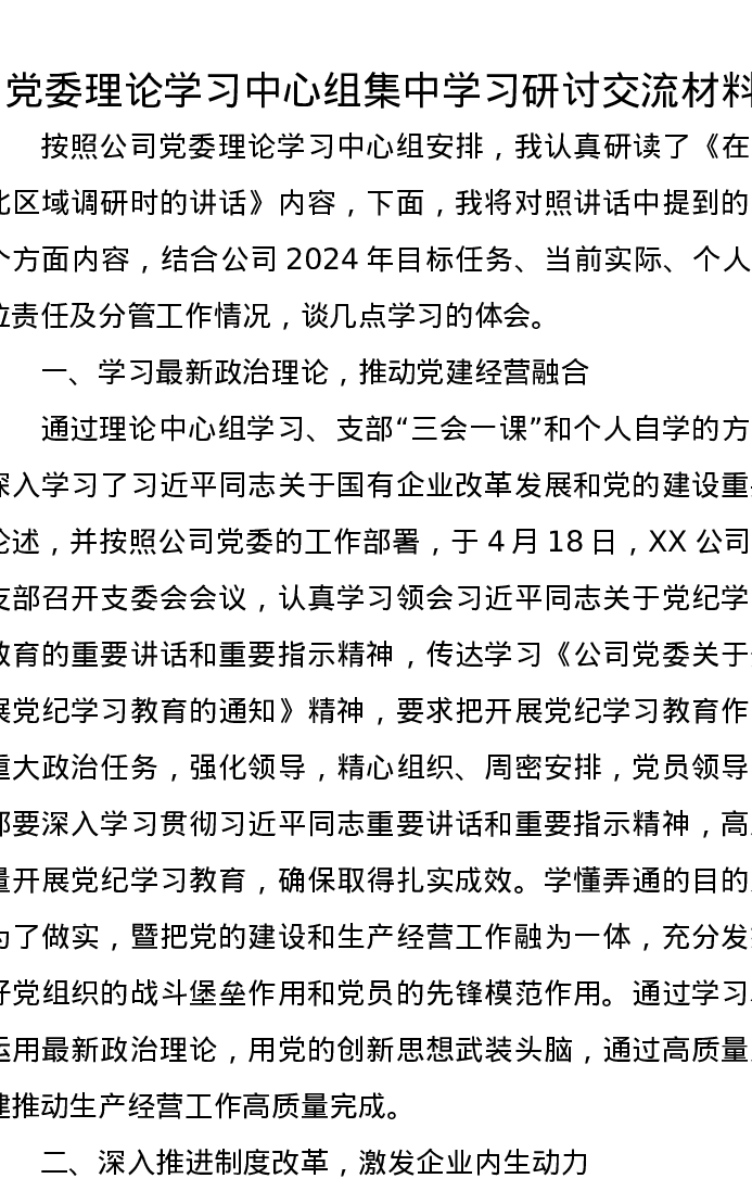 党委理论学习中心组集中学习研讨交流发言材料