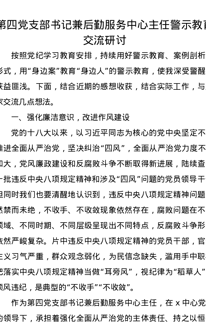 第四党支部书记兼后勤服务中心主任警示教育交流研讨发言