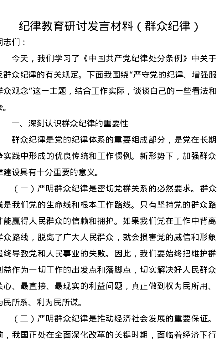 纪律教育研讨发言材料(群众纪律)