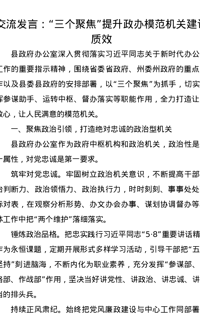 交流发言:“三个聚焦”提升政办模范机关建设质效