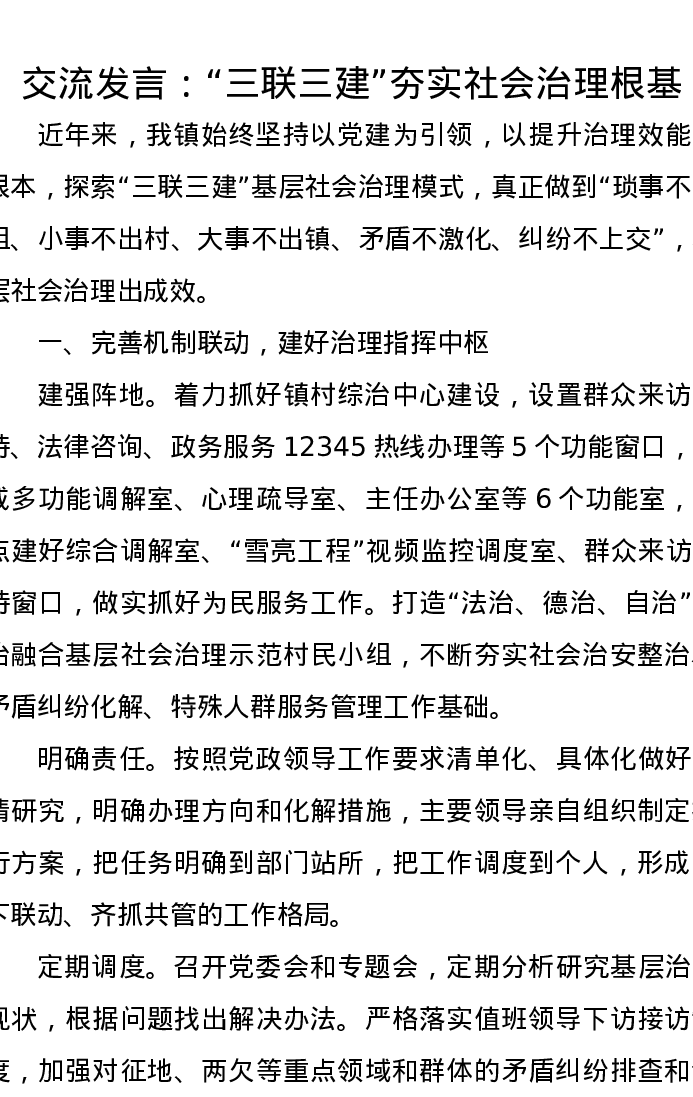 交流发言:“三联三建”夯实社会治理根基