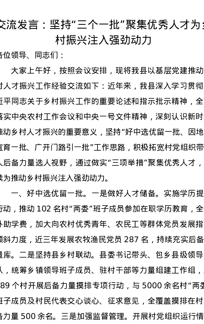 交流发言:坚持“三个一批”聚集优秀人才为乡村振兴注入强劲动力