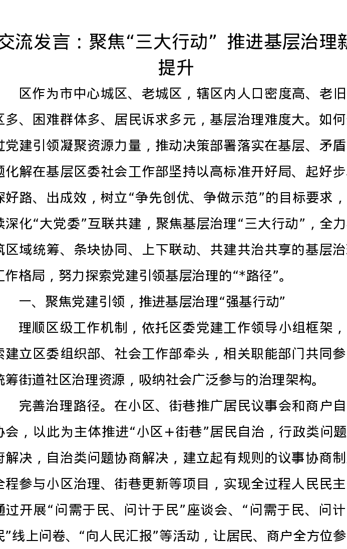 交流发言:聚焦“三大行动,推进基层治理新提升