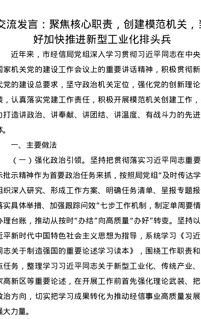 交流发言:聚焦核心职责,创建模范机关,当好加快推进新型工业化排头兵