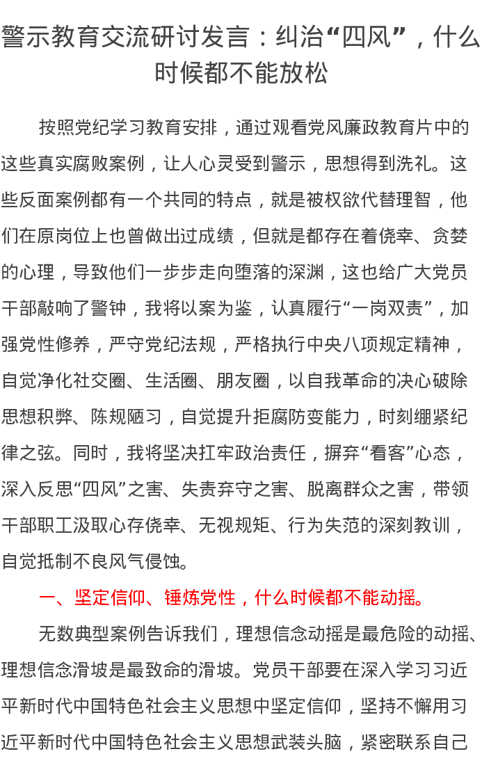 警示教育交流研讨发言:纠治“四风”,什么时候都不能放松