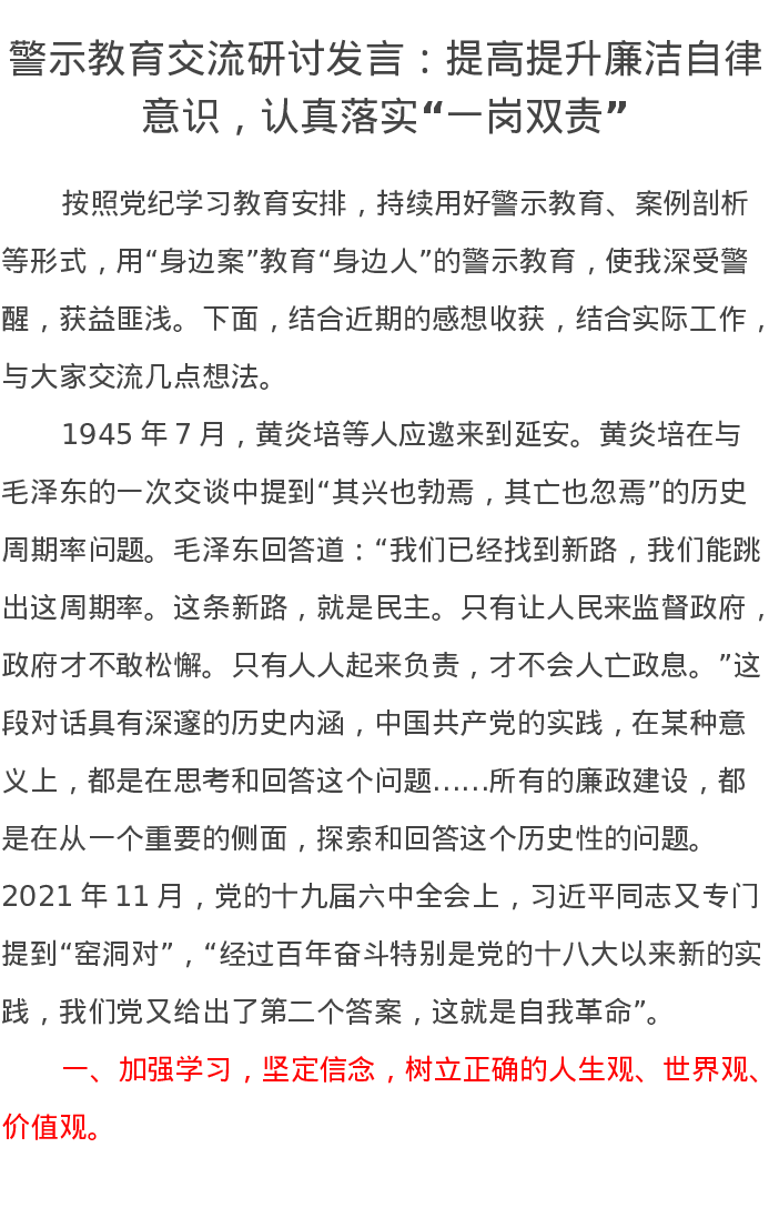 警示教育交流研讨发言:提高提升廉洁自律意识,认真落实“一岗双责”