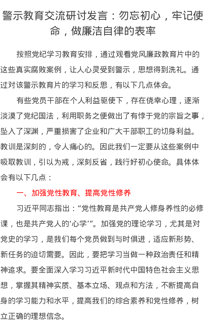 警示教育交流研讨发言:勿忘初心,牢记使命,做廉洁自律的表率