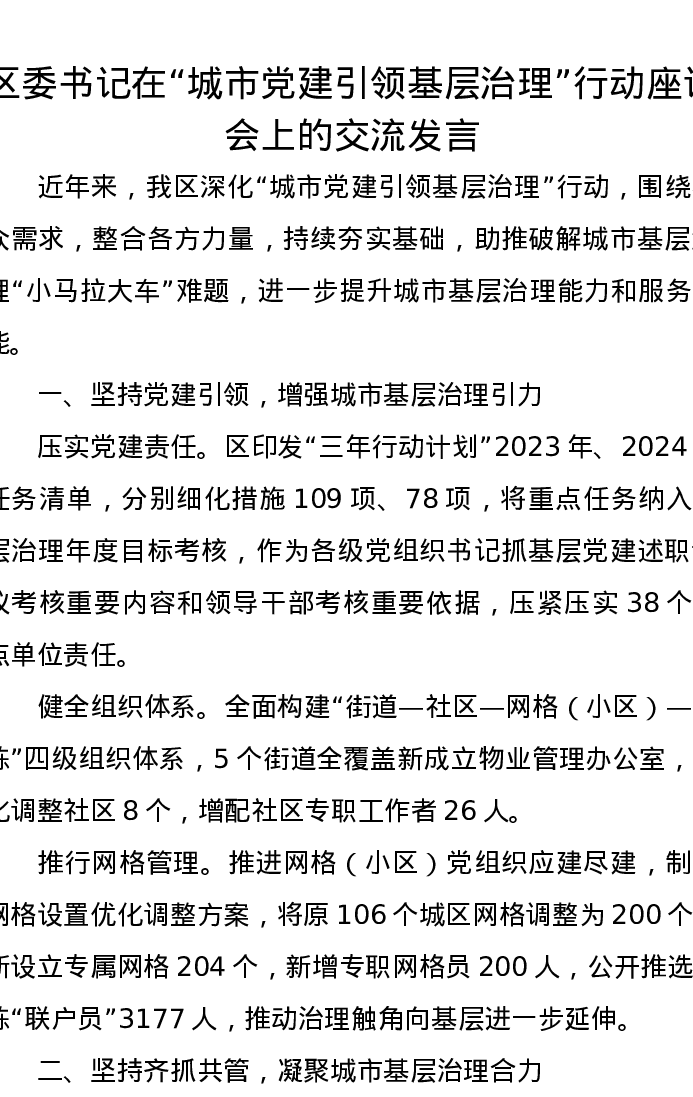 区委书记在“城市党建引领基层治理”行动座谈会上的交流发言