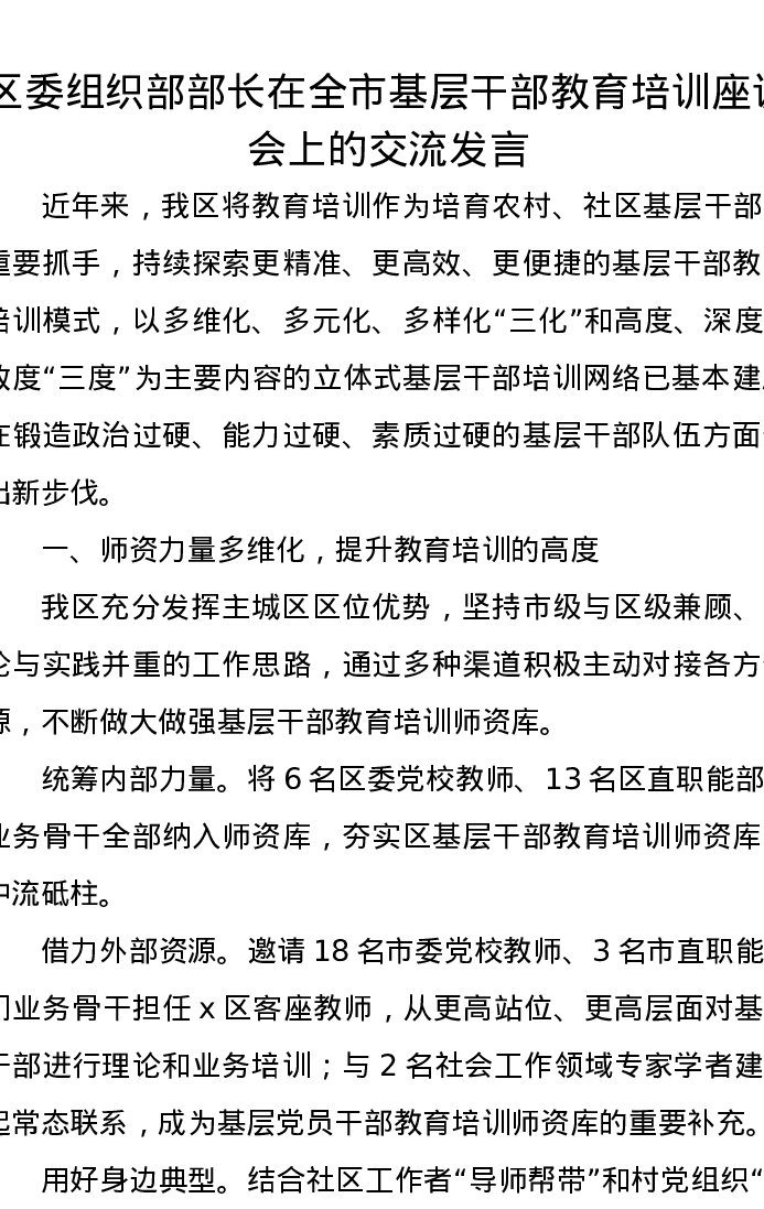 区委组织部部长在全市基层干部教育培训座谈会上的交流发言