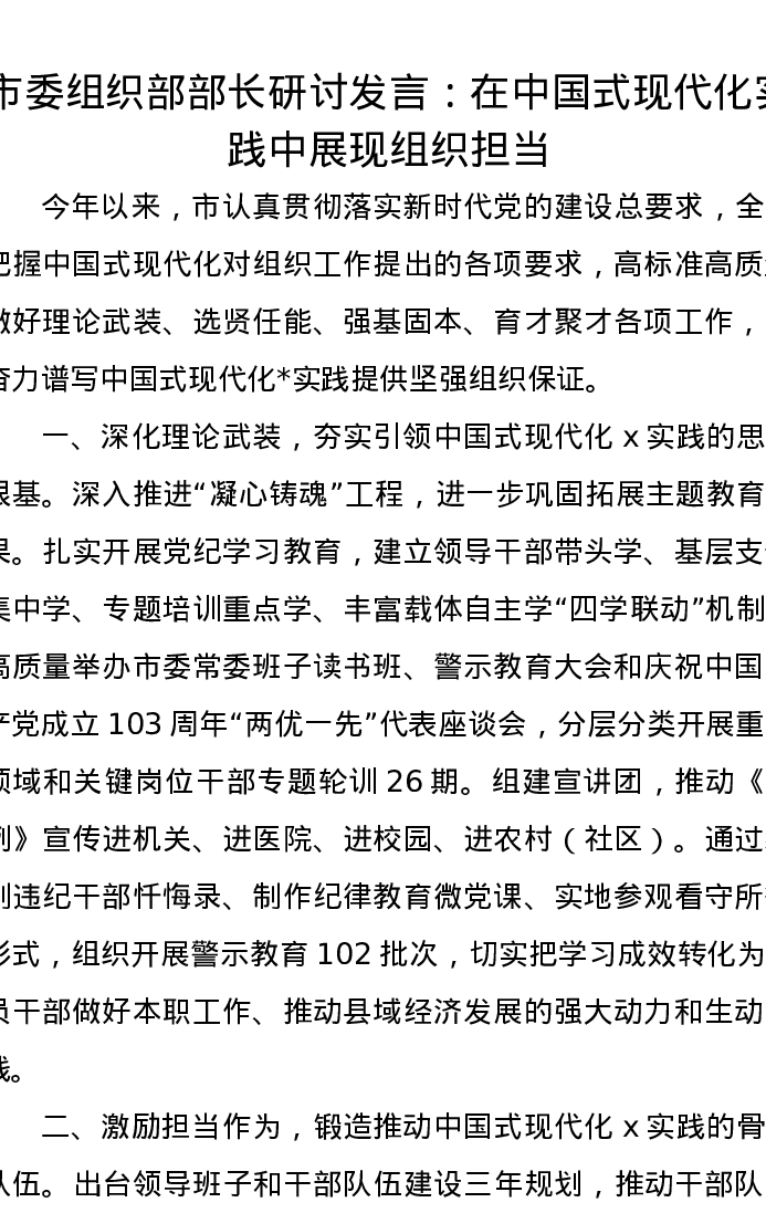 市委组织部部长研讨发言:在中国式现代化实践中展现组织担当
