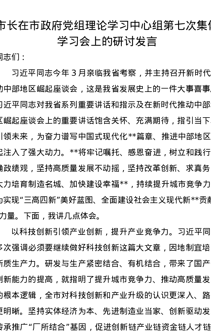 市长在市政府党组理论学习中心组第七次集体学习会上的研讨发言