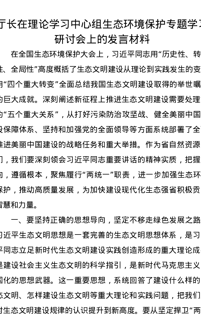 厅长在理论学习中心组生态环境保护专题学习研讨会上的发言材料