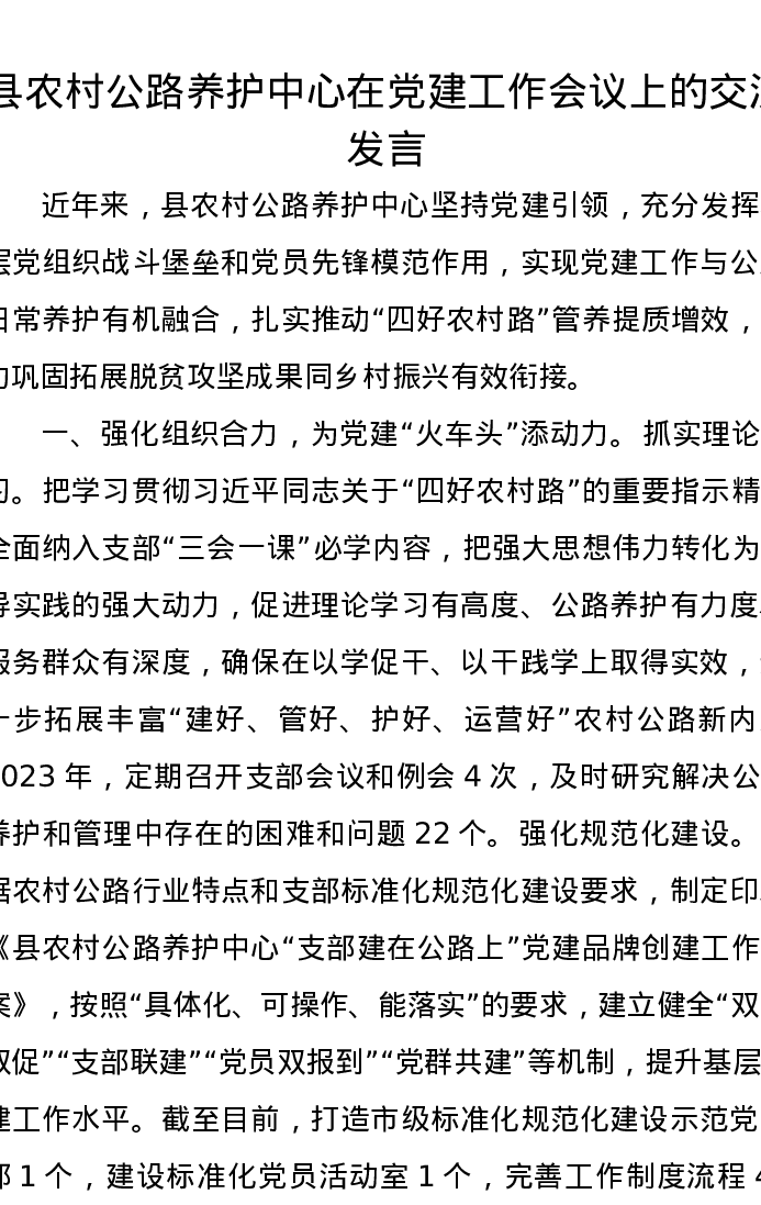 县农村公路养护中心在党建工作会议上的交流发言