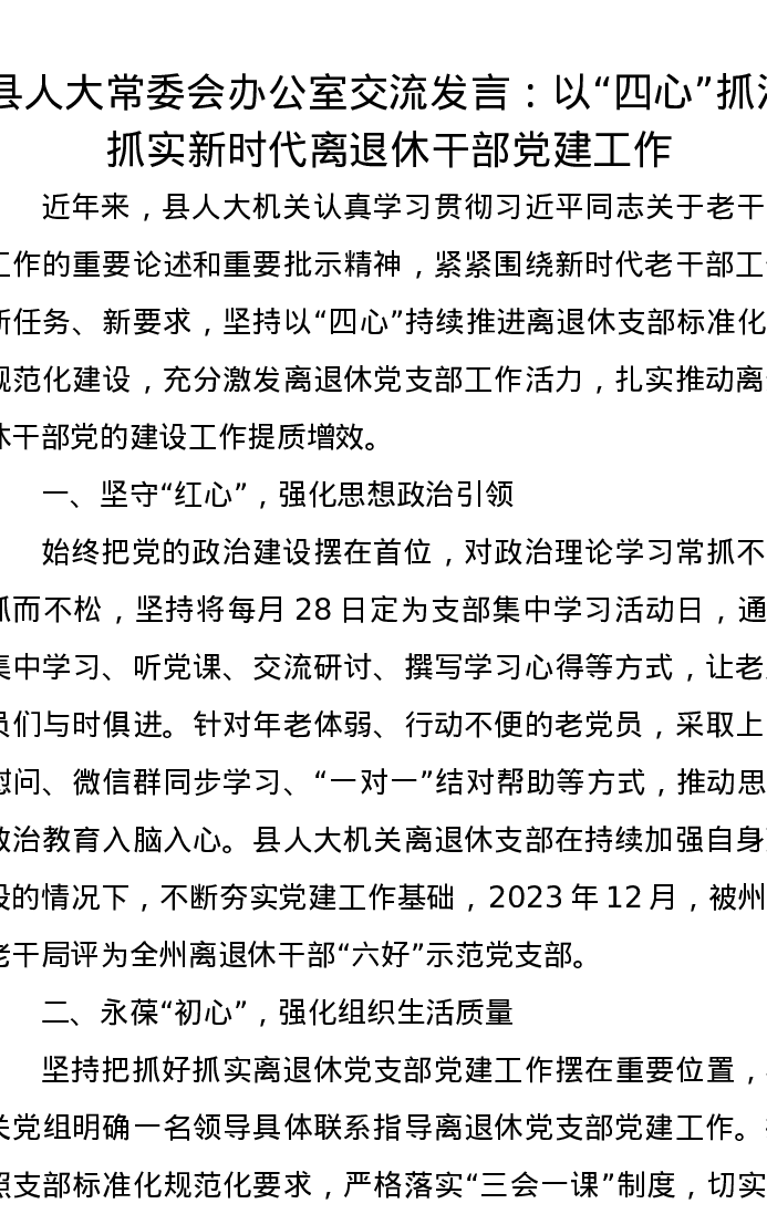 县人大常委会办公室交流发言:以“四心”抓深抓实新时代离退休干部党建工作