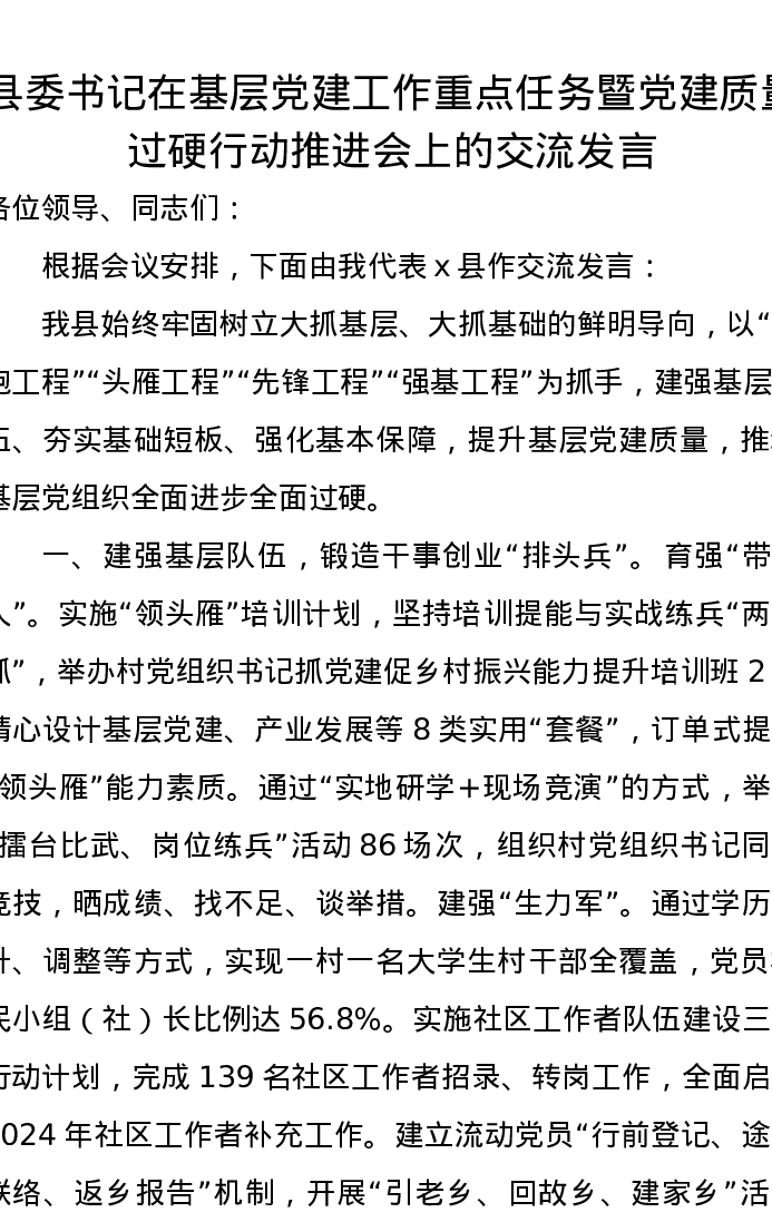 县委书记在基层党建工作重点任务暨党建质量过硬行动推进会上的交流发言
