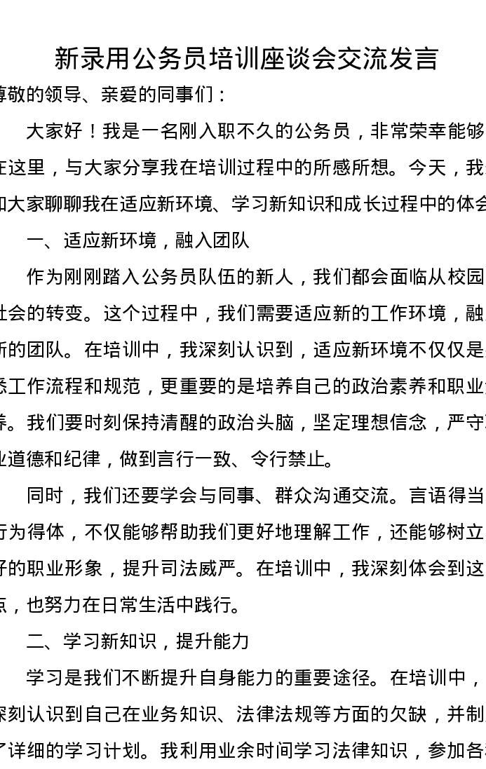 新录用公务员培训座谈会交流发言