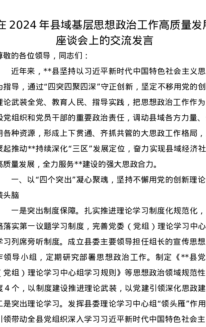 在2024年县域基层思想政治工作高质量发展座谈会上的交流发言