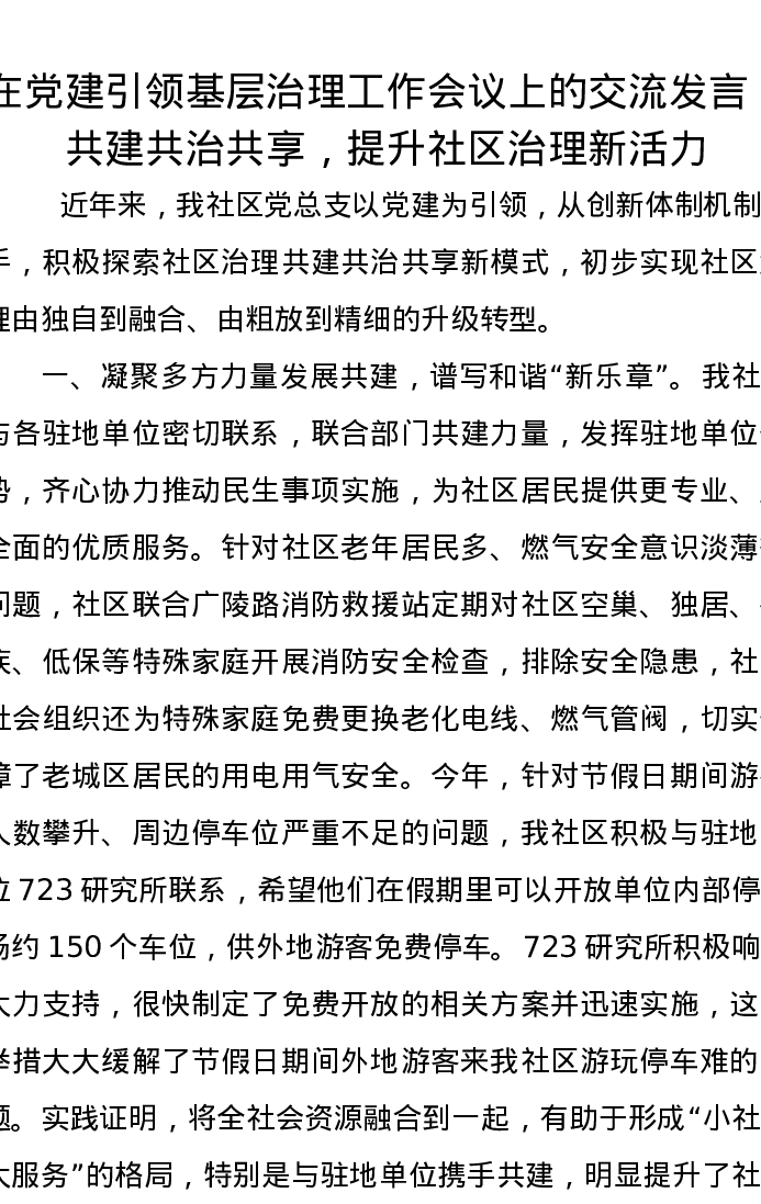 在党建引领基层治理工作会议上的交流发言:共建共治共享,提升社区治理新活力