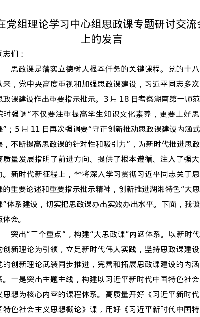 在党组理论学习中心组思政课专题研讨交流会上的发言