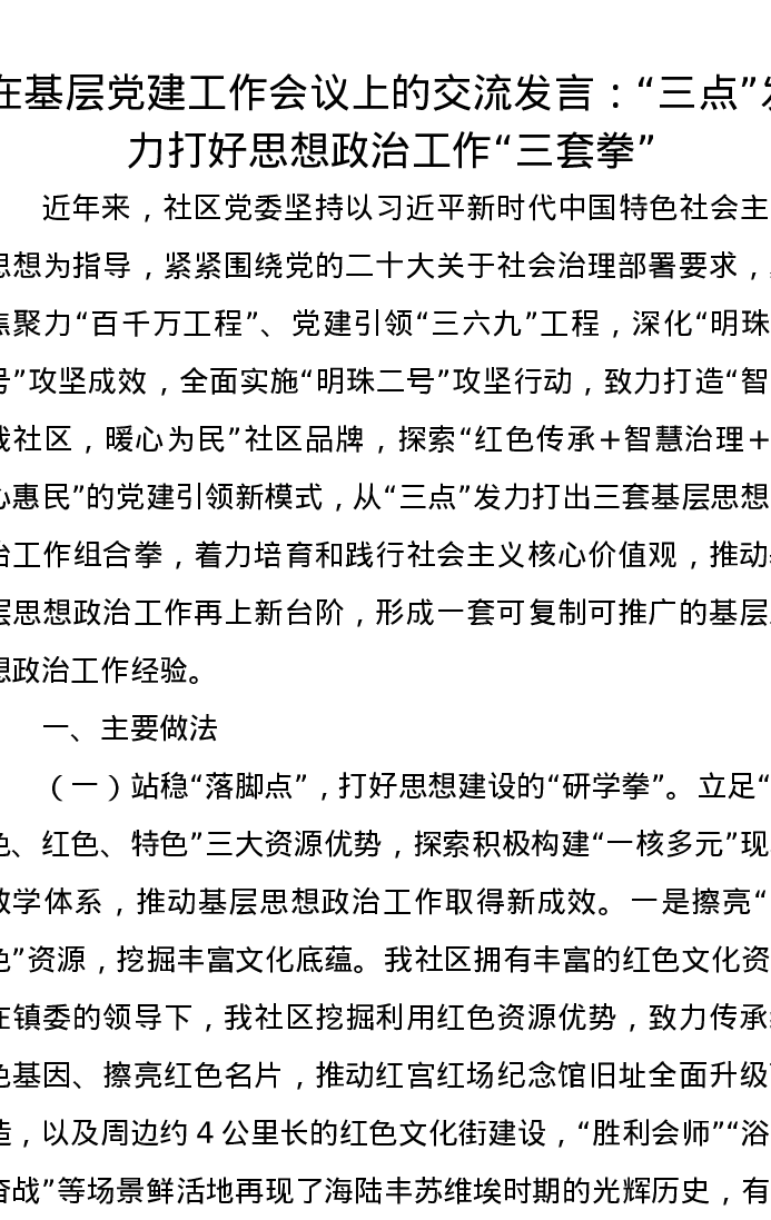 在基层党建工作会议上的交流发言:“三点”发力打好思想政治工作“三套拳”