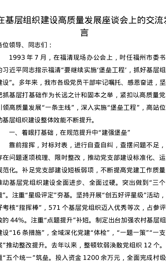 在基层组织建设高质量发展座谈会上的交流发言