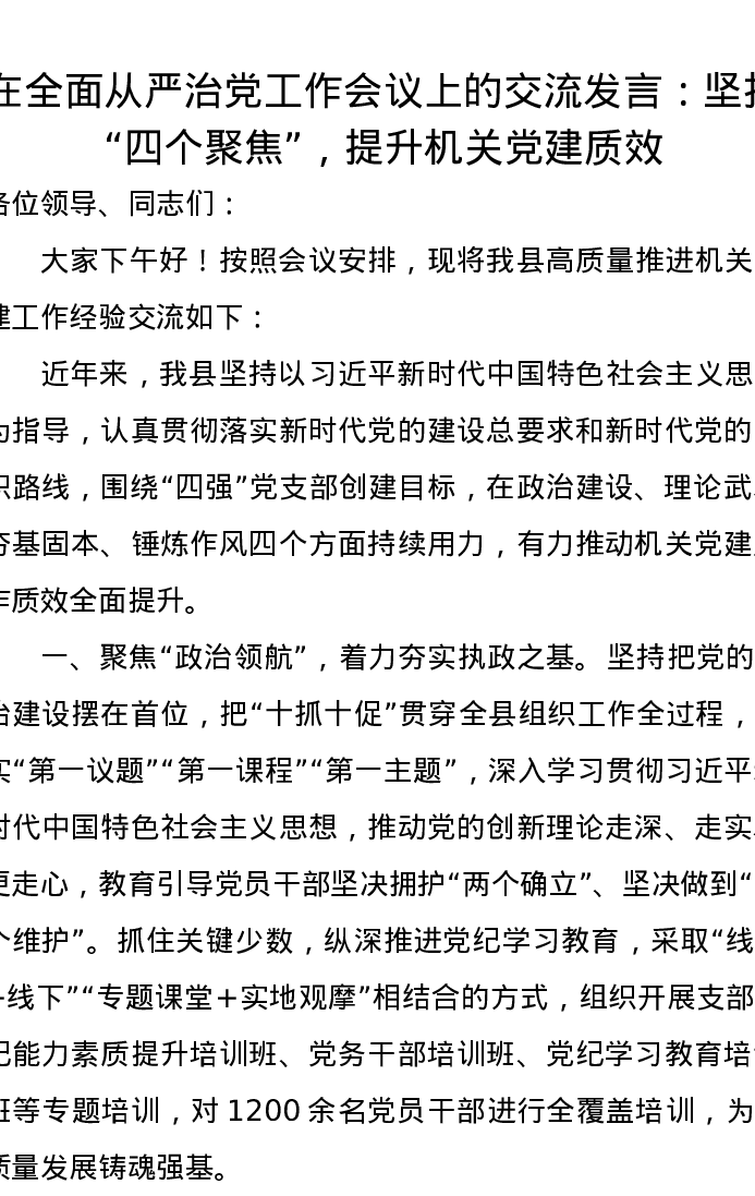 在全面从严治党工作会议上的交流发言:坚持“四个聚焦”,提升机关党建质效