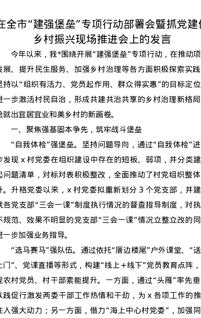 在全市“建强堡垒”专项行动部署会暨抓党建促乡村振兴现场推进会上的发言