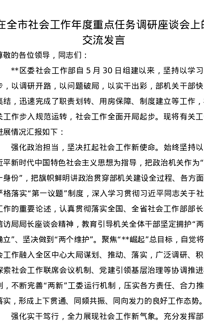 在全市社会工作年度重点任务调研座谈会上的交流发言