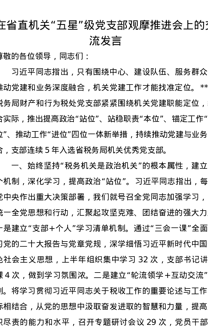 在省直机关“五星”级党支部观摩推进会上的交流发言