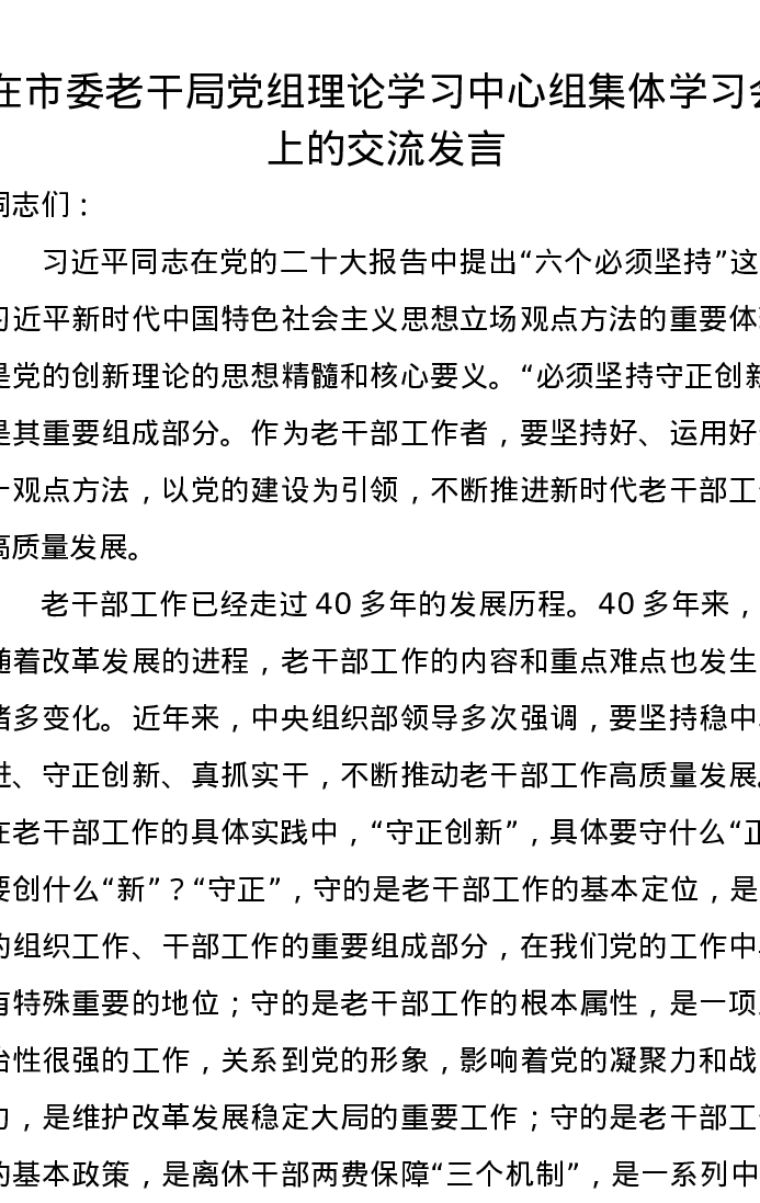 在市委老干局党组理论学习中心组集体学习会上的交流发言