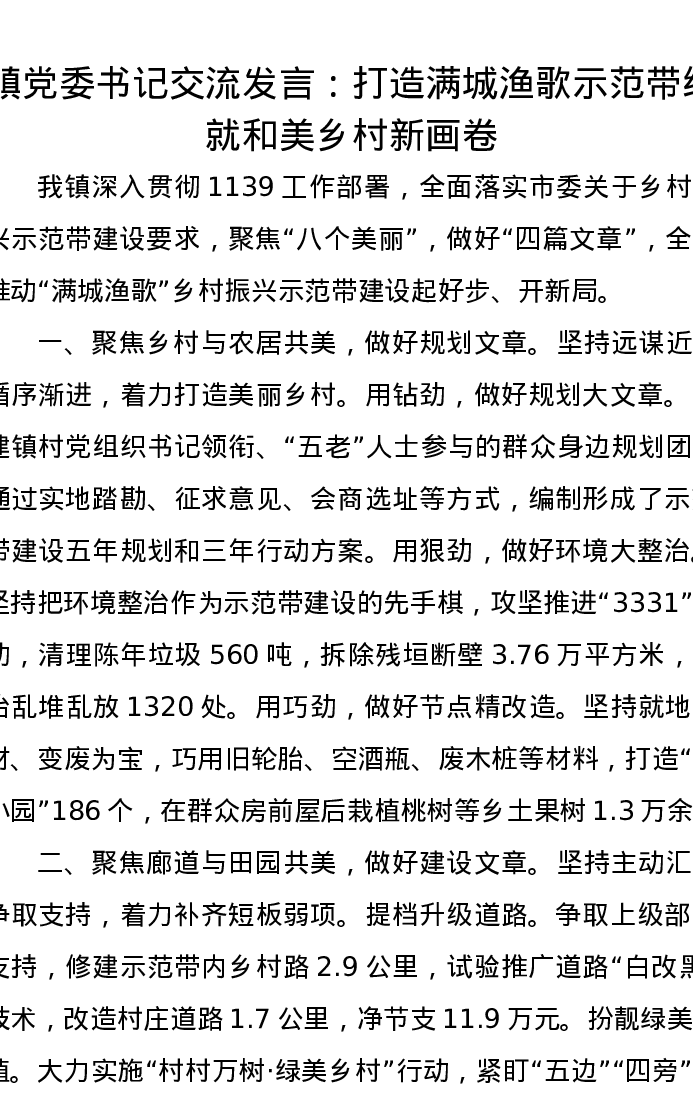 镇党委书记交流发言:打造满城渔歌示范带绘就和美乡村新画卷