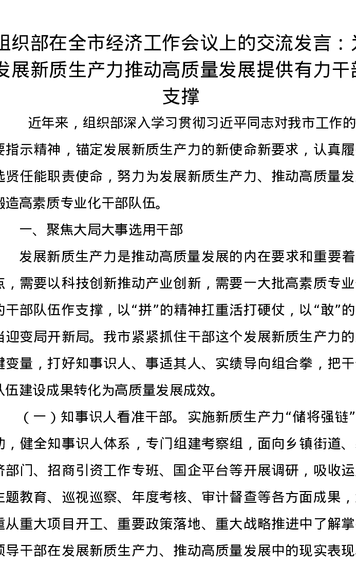 组织部在全市经济工作会议上的交流发言:为发展新质生产力推动高质量发展提供有力干部支撑
