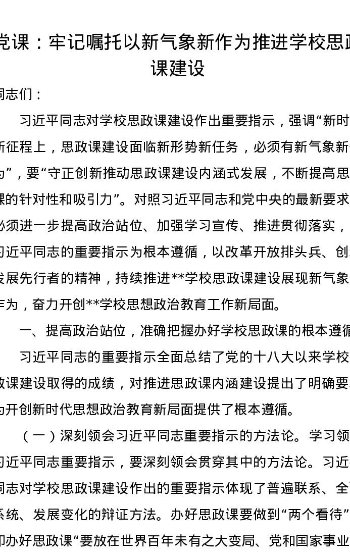 党课讲稿:牢记嘱托以新气象新作为推进学校思政课建设