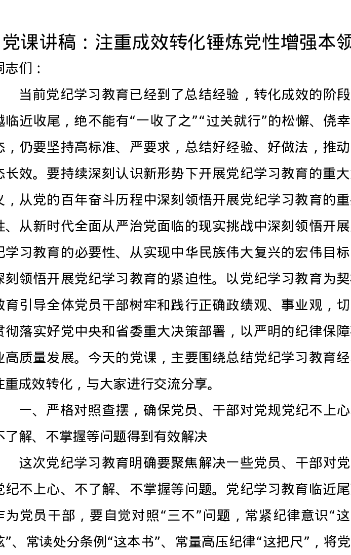 党课讲稿:注重成效转化锤炼党性增强本领