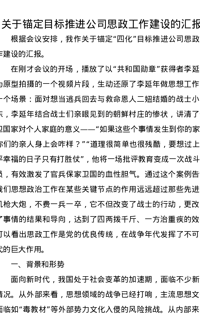 关于锚定目标推进公司思政工作建设的汇报