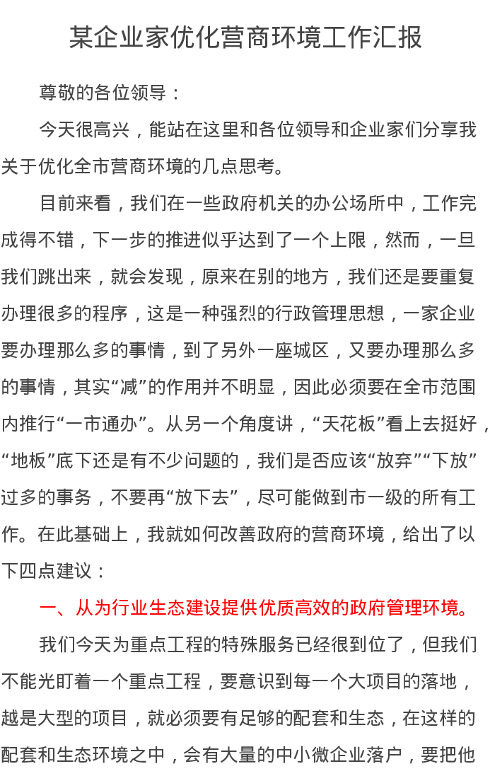 某企业家优化营商环境工作汇报