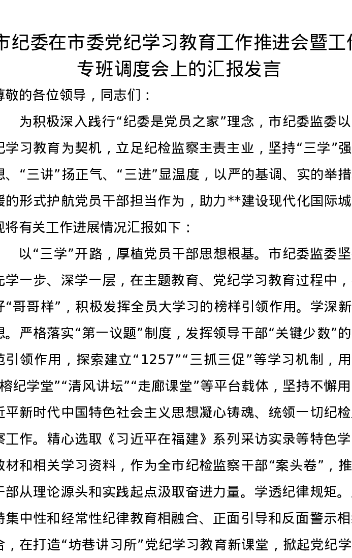 市纪委在市委党纪学习教育工作推进会暨工作专班调度会上的汇报发言
