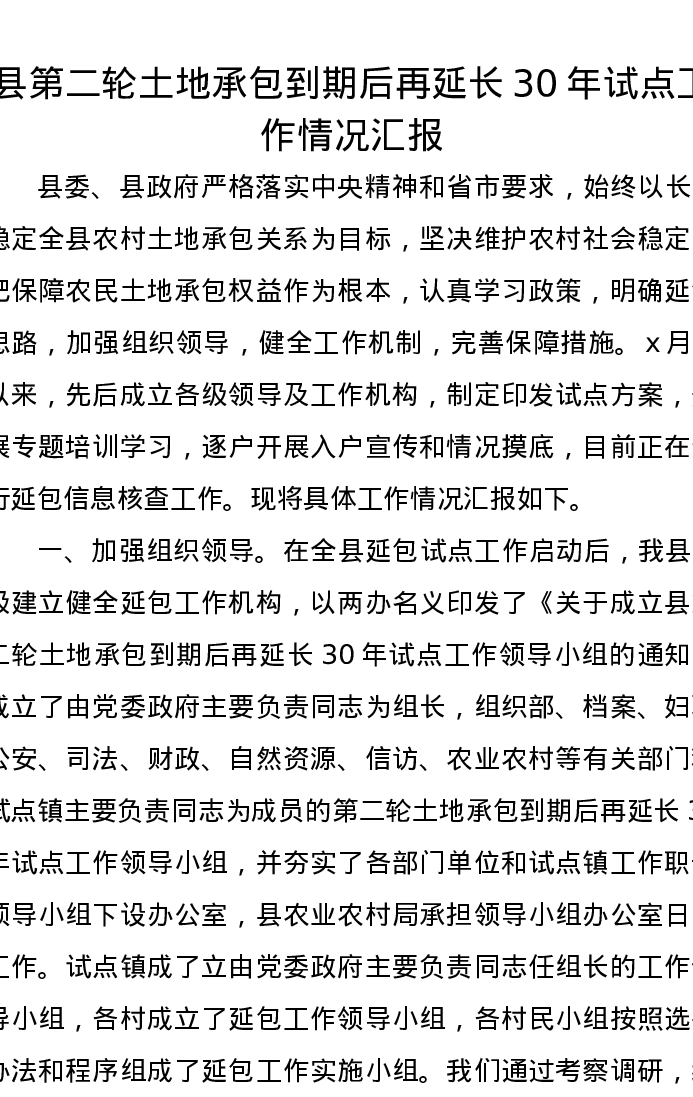 县第二轮土地承包到期后再延长30年试点工作情况汇报