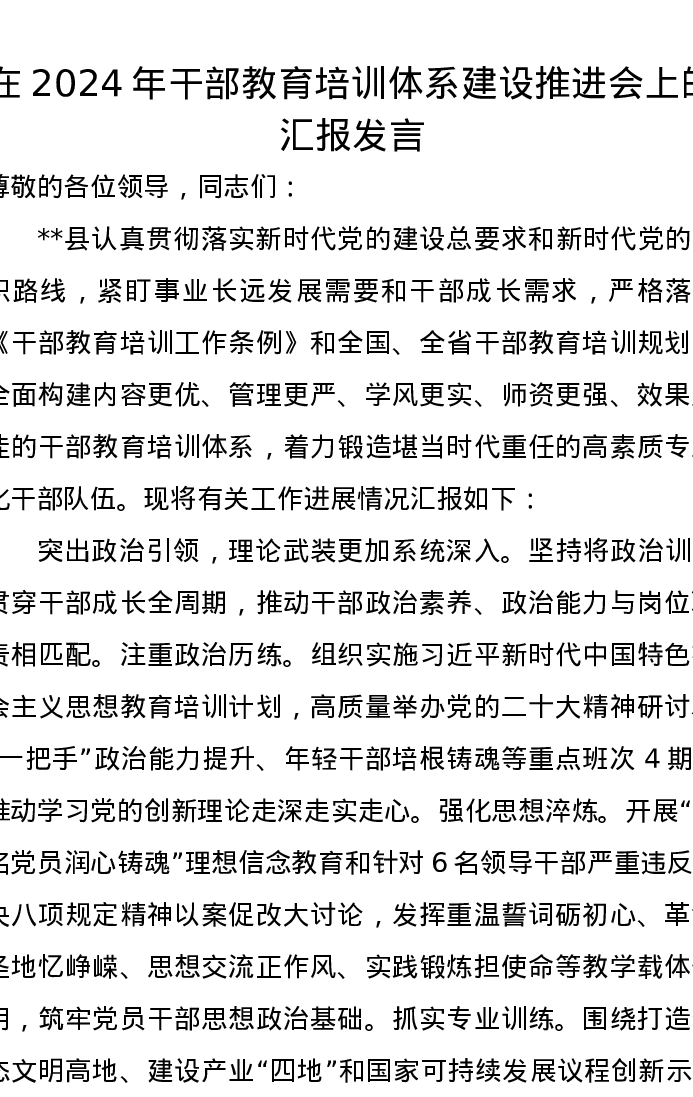 在2024年干部教育培训体系建设推进会上的汇报发言