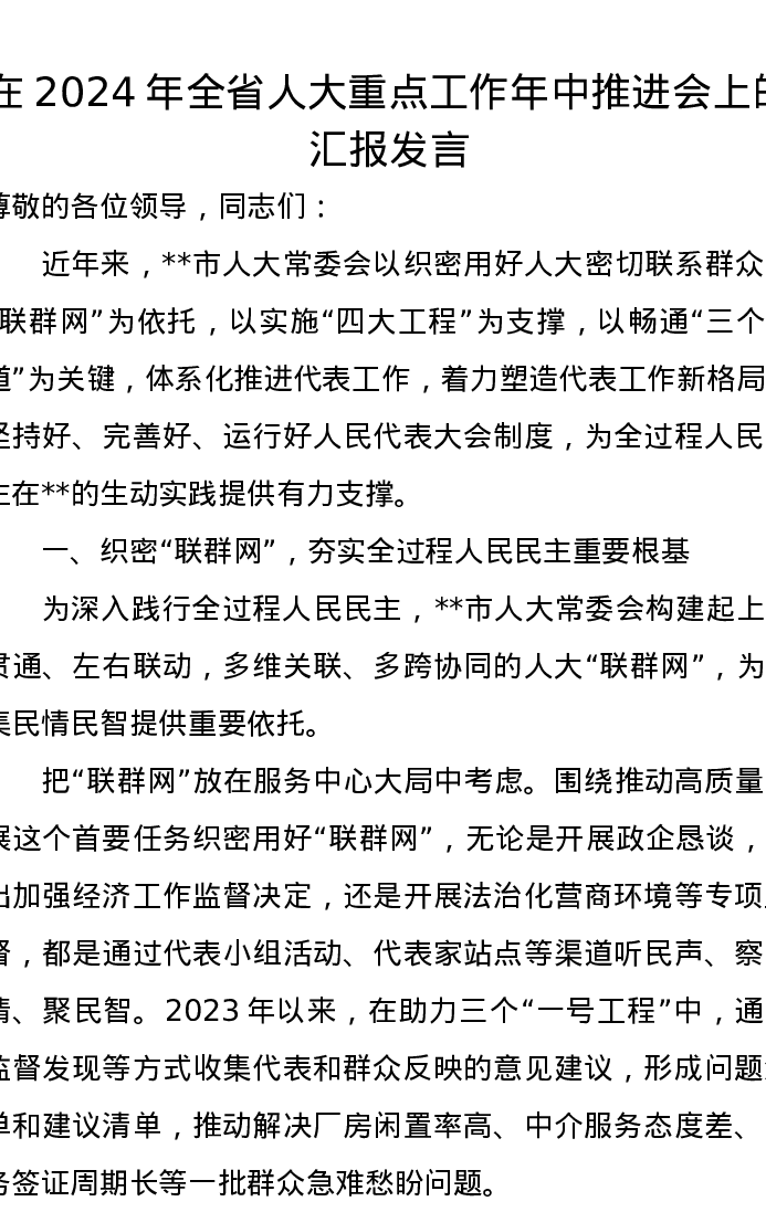 在2024年全省人大重点工作年中推进会上的汇报发言