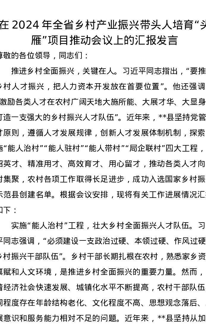 在2024年全省乡村产业振兴带头人培育“头雁”项目推动会议上的汇报发言