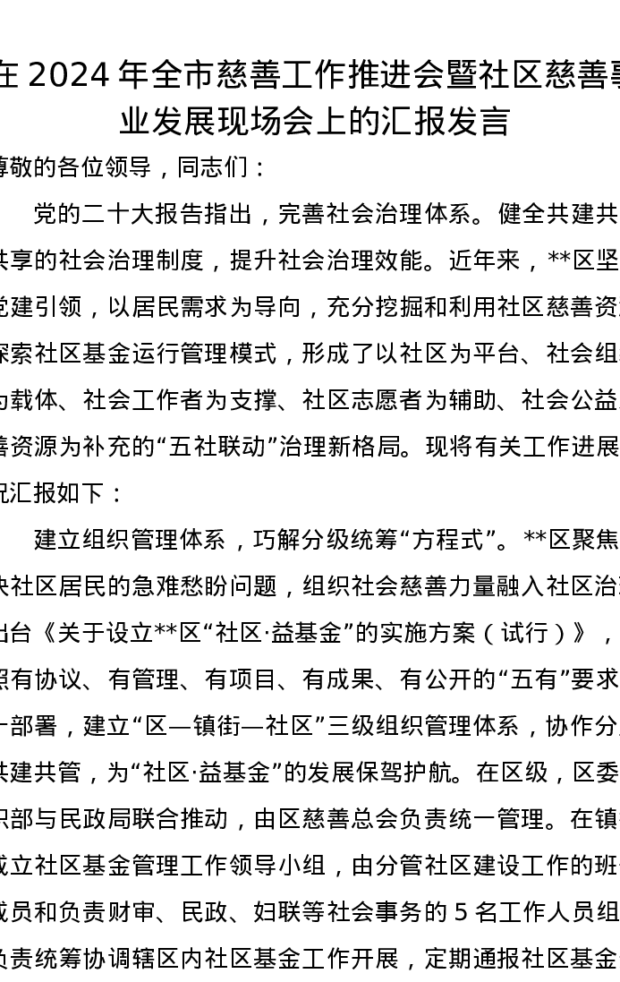 在2024年全市慈善工作推进会暨社区慈善事业发展现场会上的汇报发言