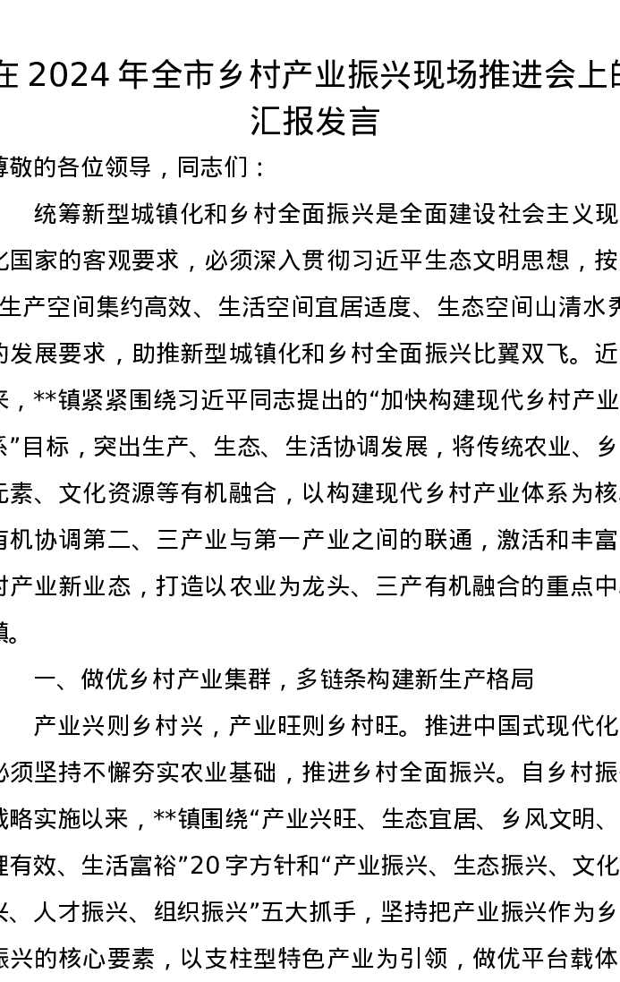 在2024年全市乡村产业振兴现场推进会上的汇报发言