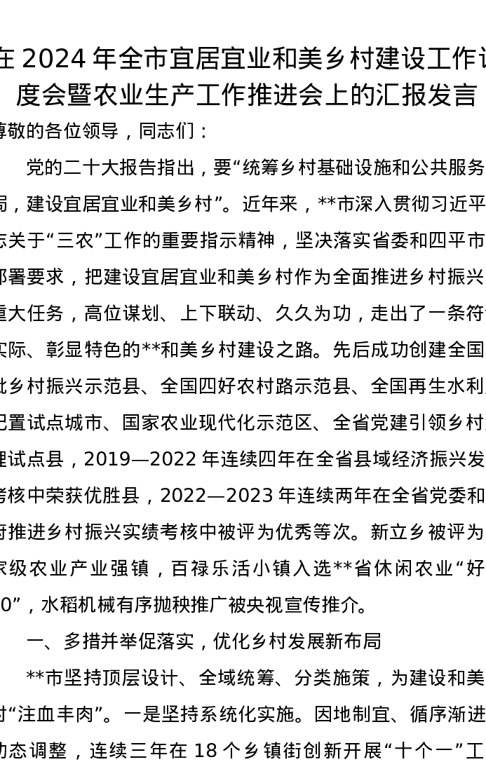 在2024年全市宜居宜业和美乡村建设工作调度会暨农业生产工作推进会上的汇报发言
