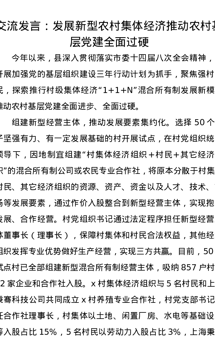 交流发言:发展新型农村集体经济推动农村基层党建全面过硬